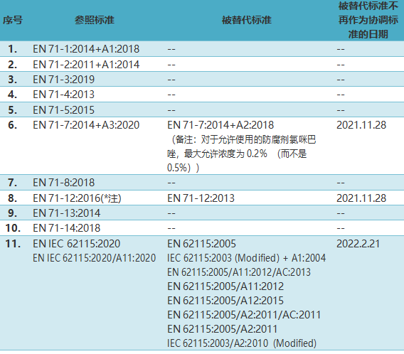 (2)EN 71-12:2016《玩具安全-第12部分:N-亚硝胺和N-亚硝基化合物》将被列为玩具安全指令的协调标准。先前版本EN 71-12:2013将于2021年11月28日撤回;