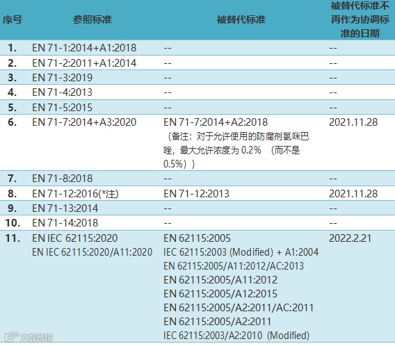 玩具安全指令2009/48/EC参照的协调标准完整列表(自2021年5月31日起)如下表:
