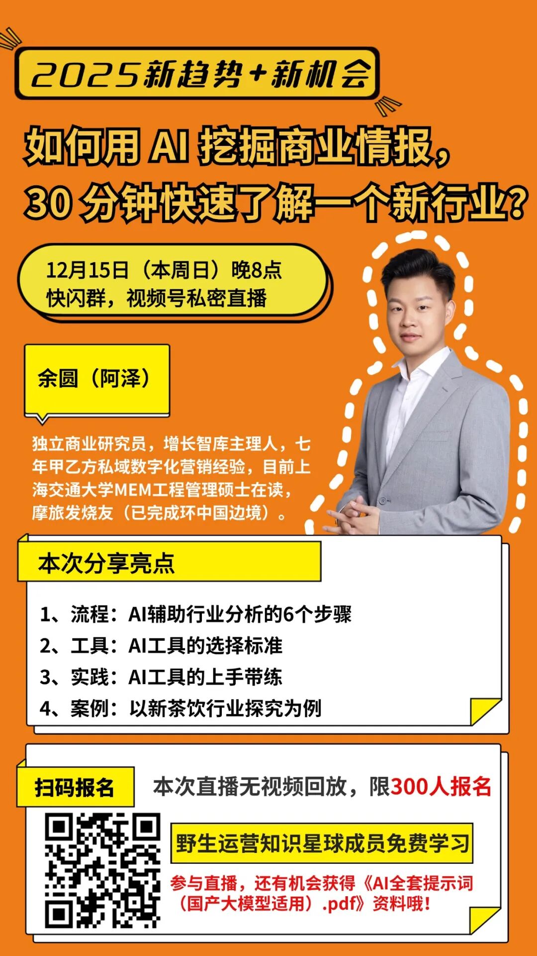 所以,这周日晚8点,我请来了我的好朋友“阿泽”,独立商业研究员,增长智库主理人,七年甲乙方私域数字化营销经验,来和大家分享《用AI挖掘情报并辅助分析,30分钟快速了解新行业》。