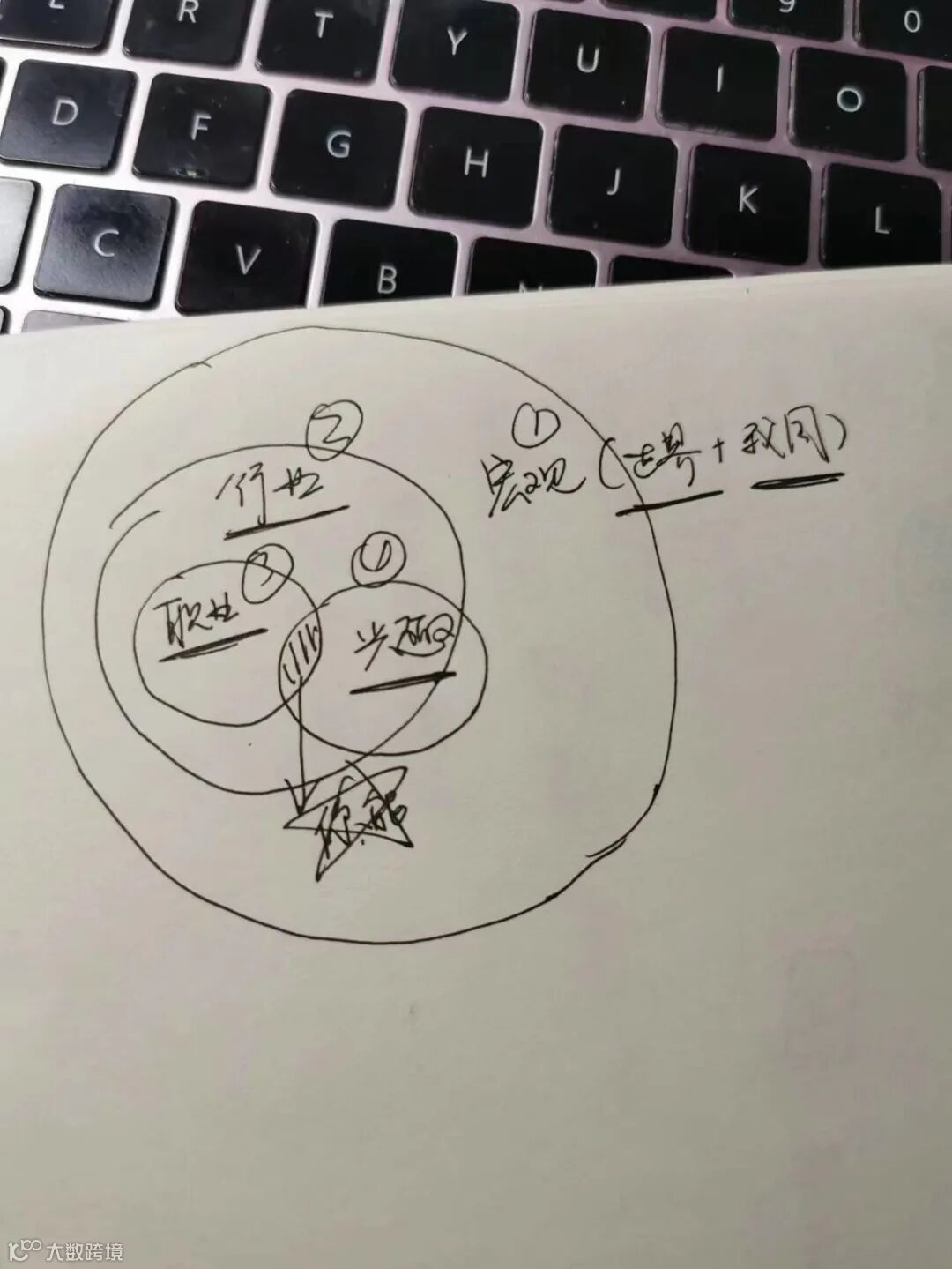 最外面是宏观环境,往里面一层是行业环境,再里面是职业和个人兴趣。这其中的交集,就是你能抓到的趋势。