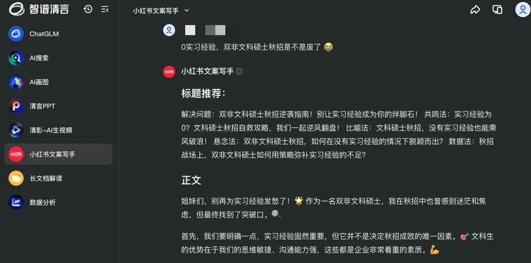 比如,你在智谱清言,用“小红书文案写手”这个智能体。
