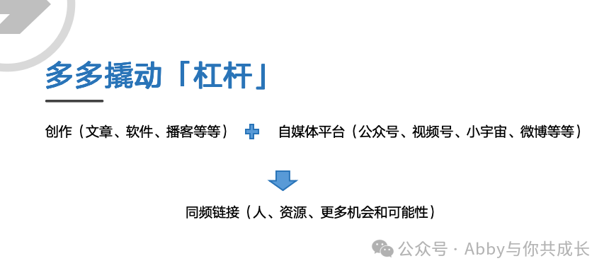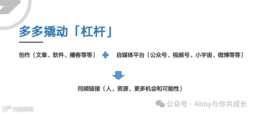 传播:传播是杠杆的放大器。通过自媒体平台,如公众号、视频号、微博、博客等,你可以将你的创作传播给更广泛的受众。