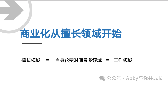 我的建议是,回顾你日常生活中投入时间最多的事情,那很可能就是你的擅长领域。对我而言,我的商业化探索始于我的工作,因为那是我投入时间最多的地方。