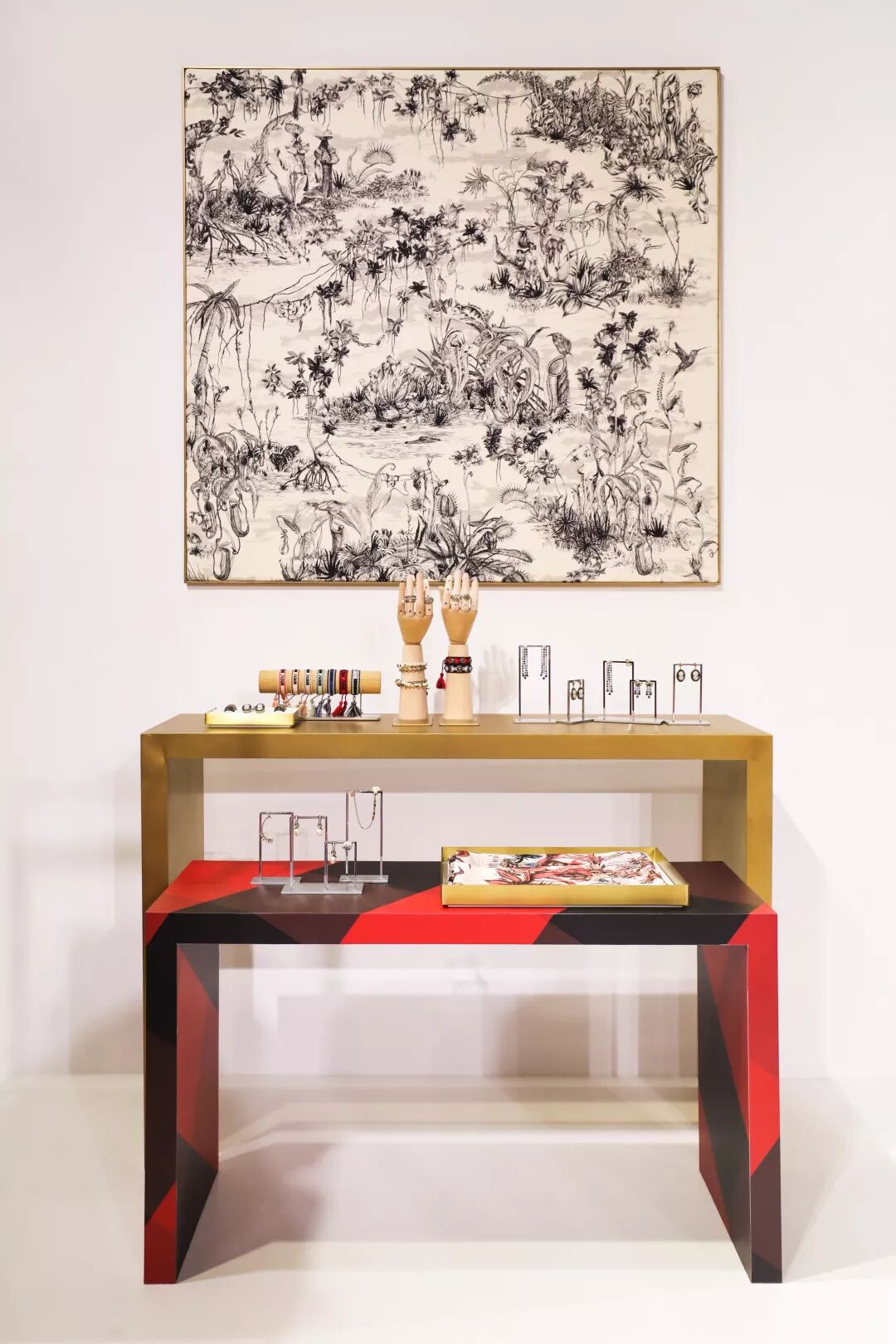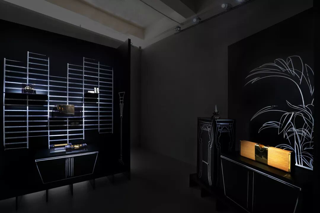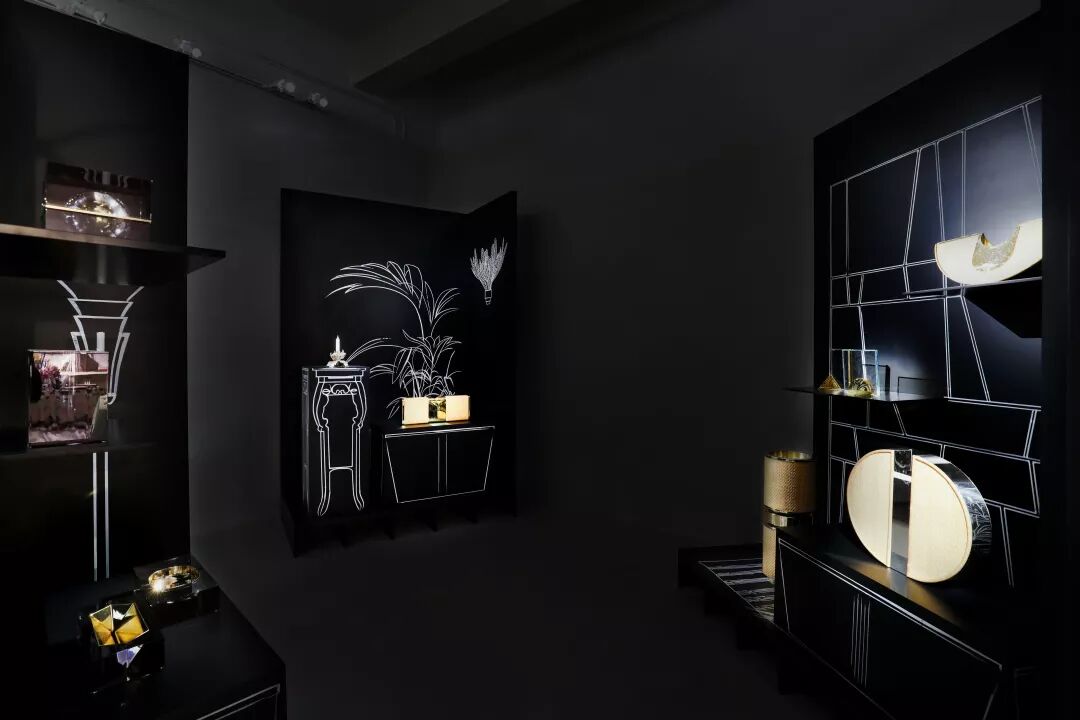 迪奥特邀DIMORE STUDIO倾情打造独家订制家具系列。其场景布置犹如一出戏剧大作,以黑色为主基调,而装饰画作与植物的轮廓均以白色粉笔蚀刻,与件件家具臻作及织物设计交辉。