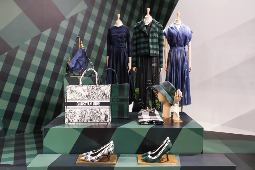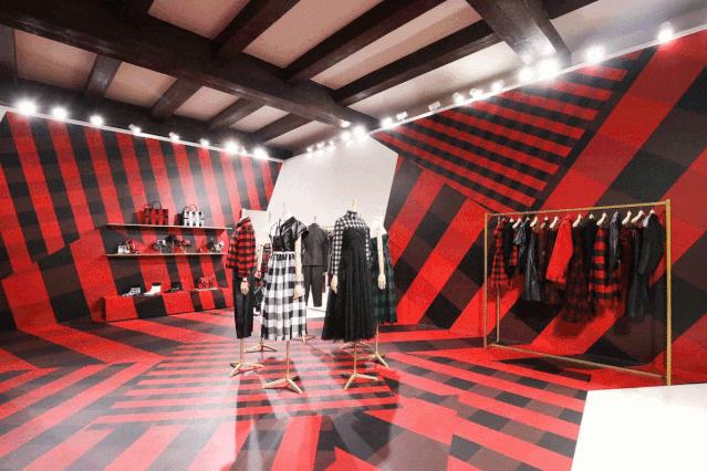 展示空间也以大片相应配色格纹的剪切与重组,一展英国文化的古典与颠覆、优雅与叛逆。