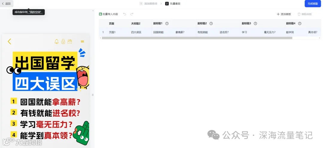 第四步:一行EXCEL就是一篇图文内容,最大可以批量生产100页图片一次。