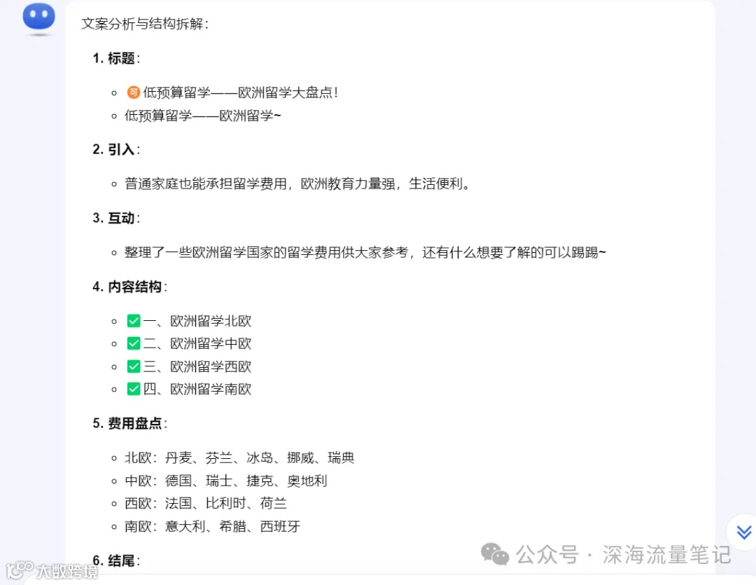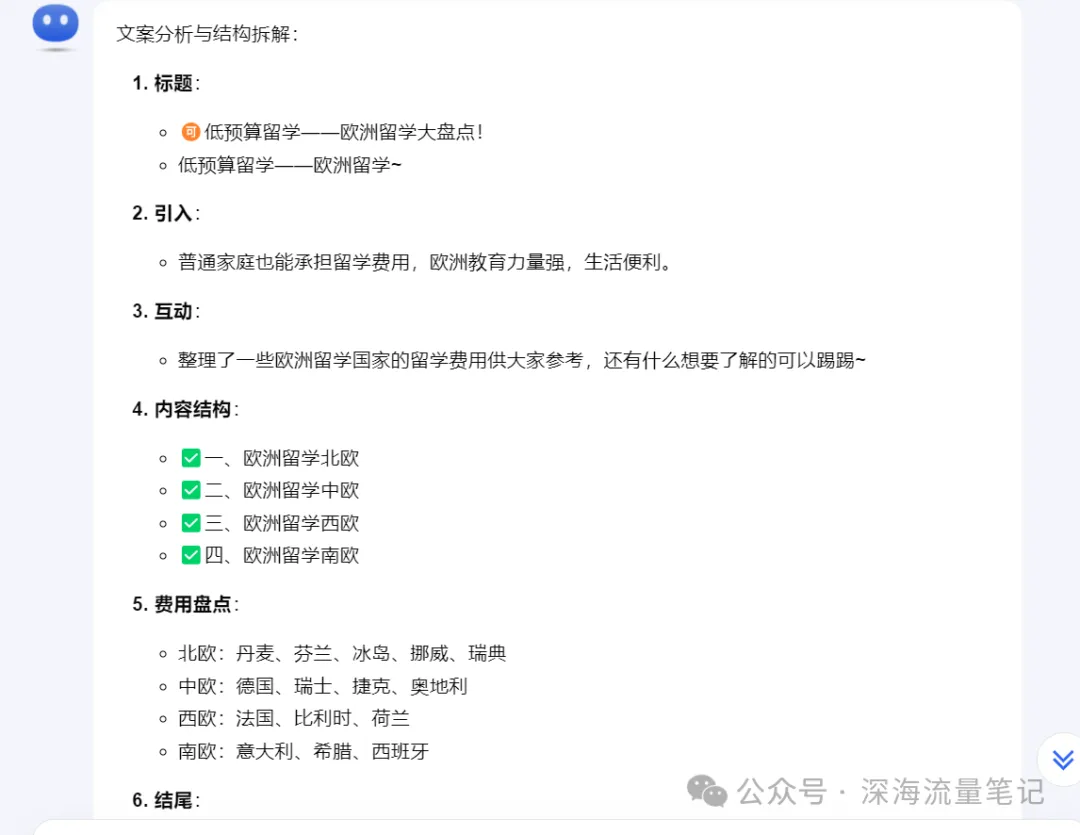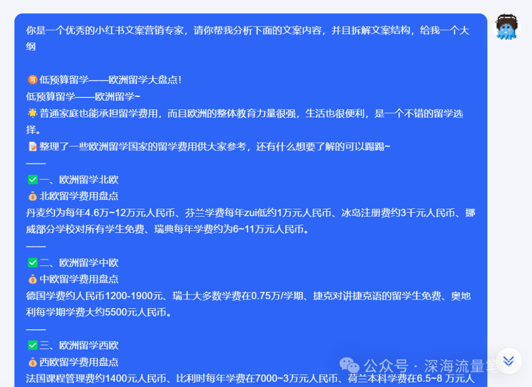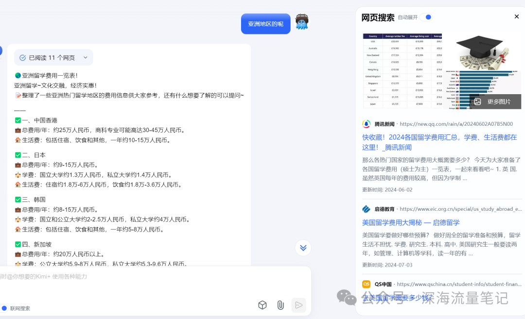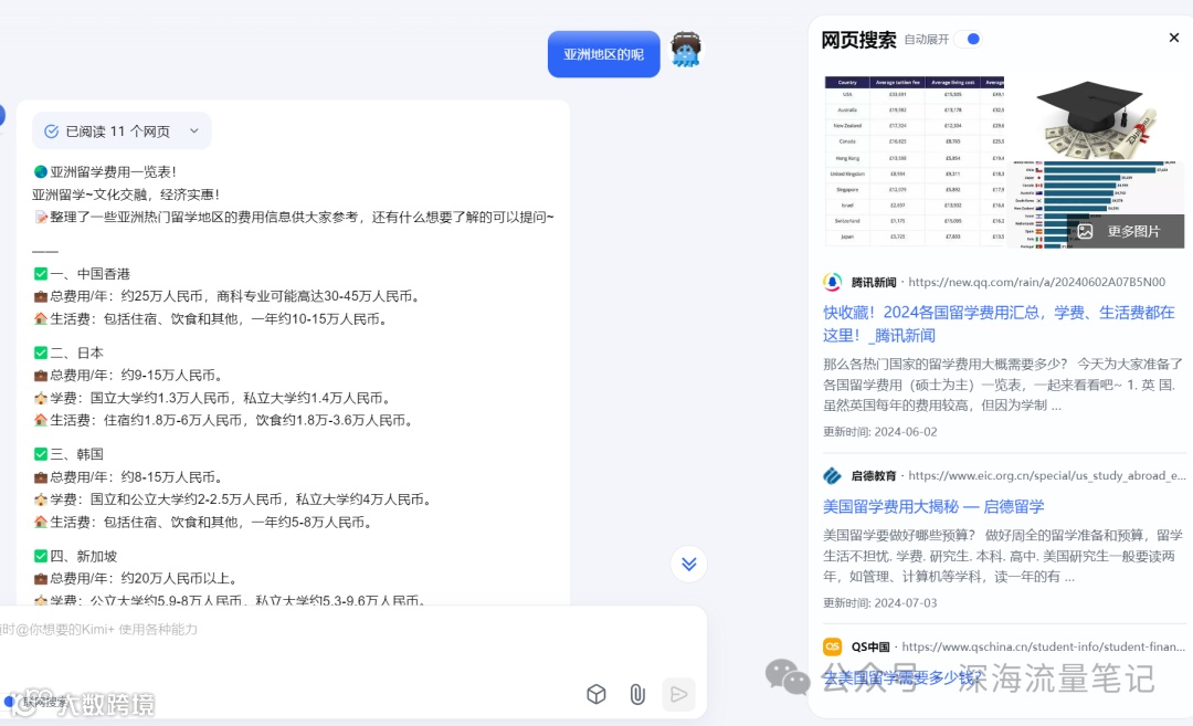 这只是根据某类型选题做的一个简单展示,留学赛道并不完全适合矩阵化内容批量制作,右侧会进行网页搜索大量信息并且进行总结。