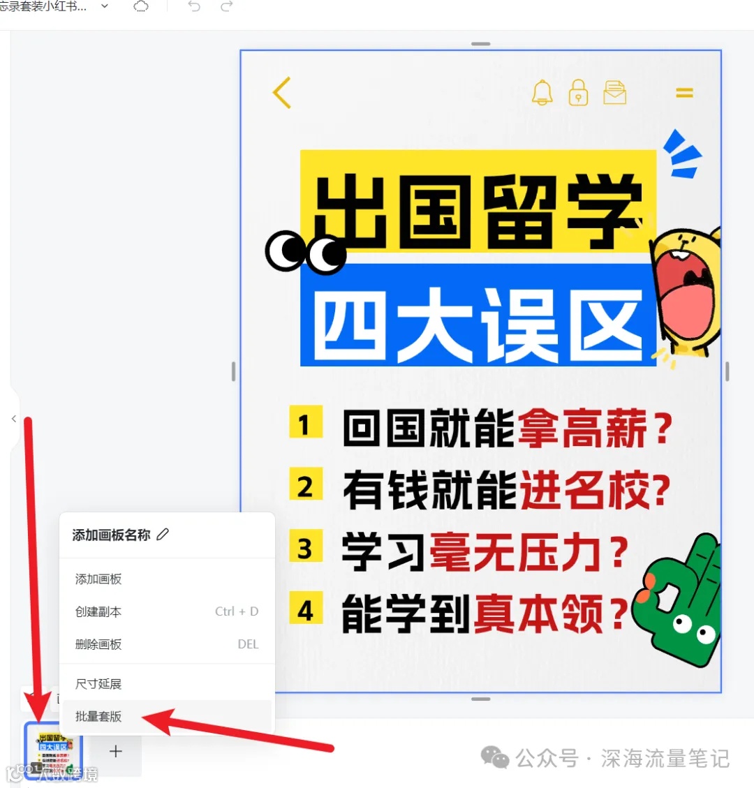 第一步:打开搞定设计模板,选择左下角画板,右上方···,选择批量套版