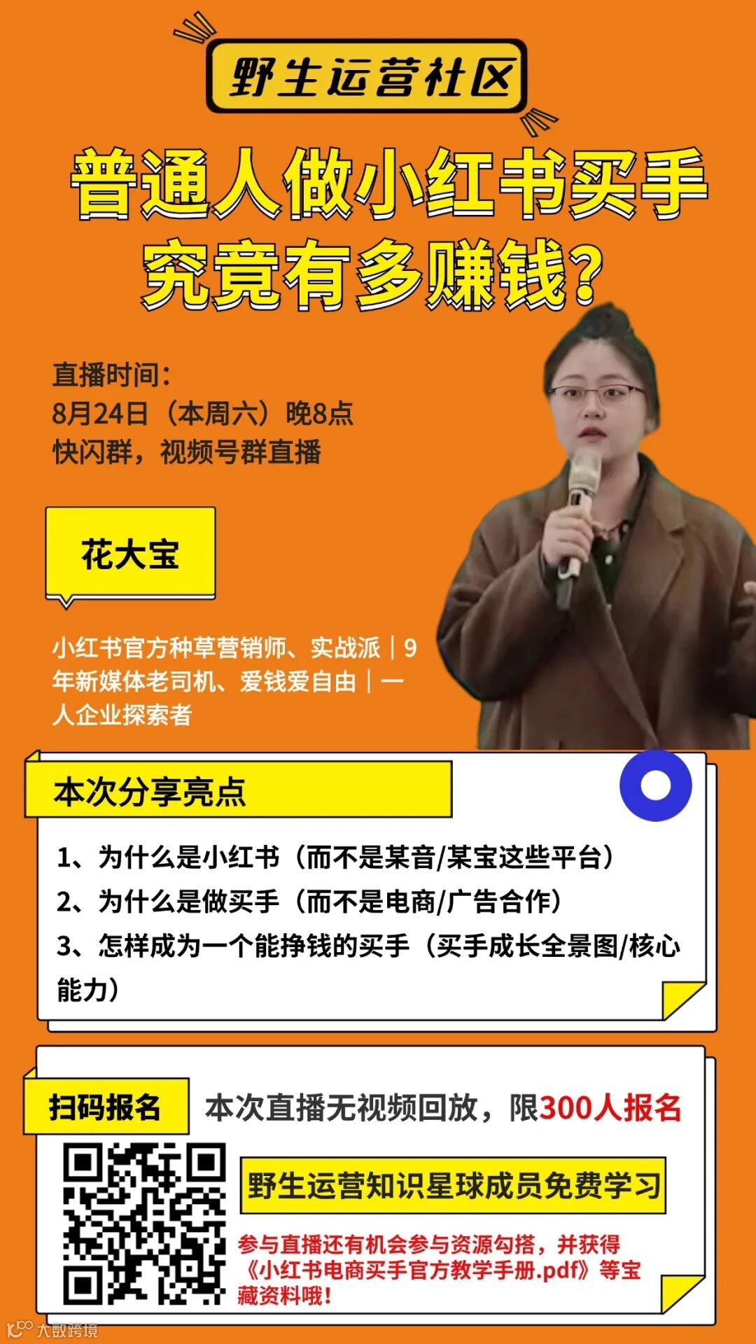 野生运营知识星球成员免费,非知识星球成员19.9/单场,参与直播课,还有机会获得《小红书电商买手官方教学手册.pdf》等宝藏资料哦!