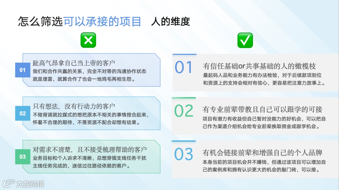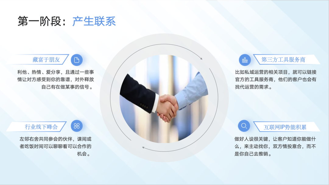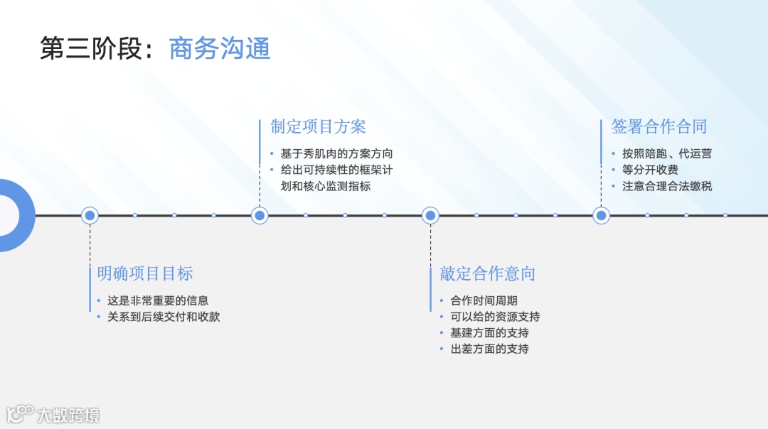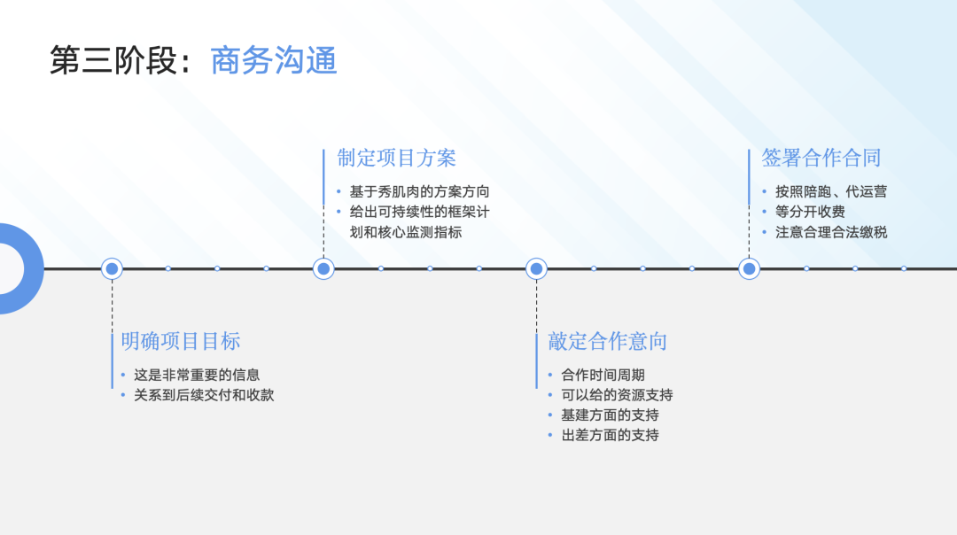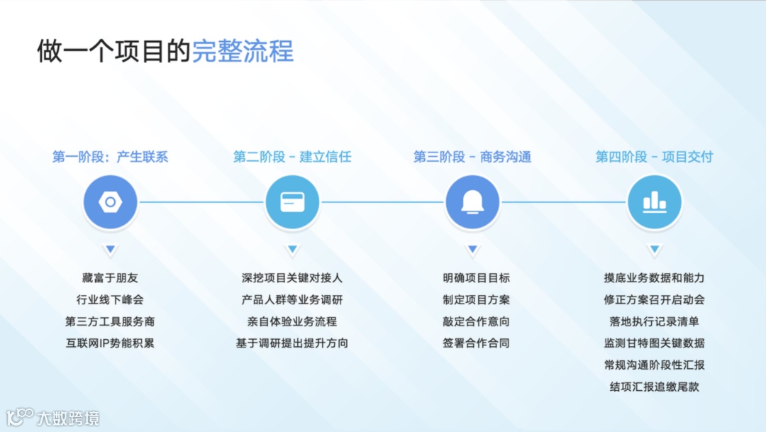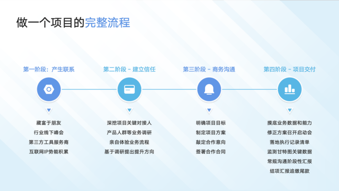 你首先要产生联系,在他的面前去建立信任;然后有一些合作的机制合作的机会,在这个时候你就要去进行商务的谈判,有一些相应的一些沟通,最重要的项目交付的部分怎么样去交付才不会有坑,才会有持续潜在的机会。