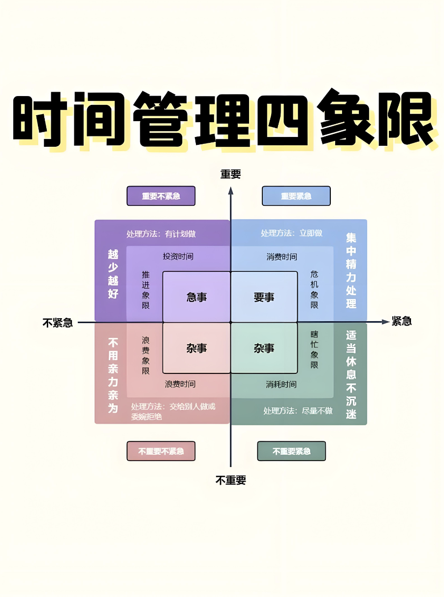 并且后续可以通过时间管理把时间分块,集中处理特定任务的方式可以提高效率。比如上午10点-12点集中攻克方案撰写,下午16-17点集中回复微信消息或邮件等。