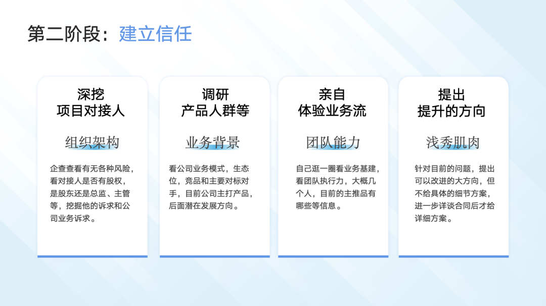 深入了解项目对接人及其公司的业务是至关重要的第一步。通过深入了解项目对接人的背景、公司的业务模式、体验业务流程,并提出切实可行的提升建议,可以有效地与项目对接人建立信任。