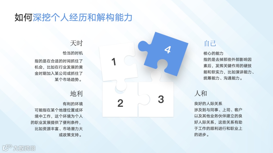 “地利”则是指环境所提供的机遇,比如互联网人才缺口期间,转行成为算法工程师的大学生能够实现高收入。