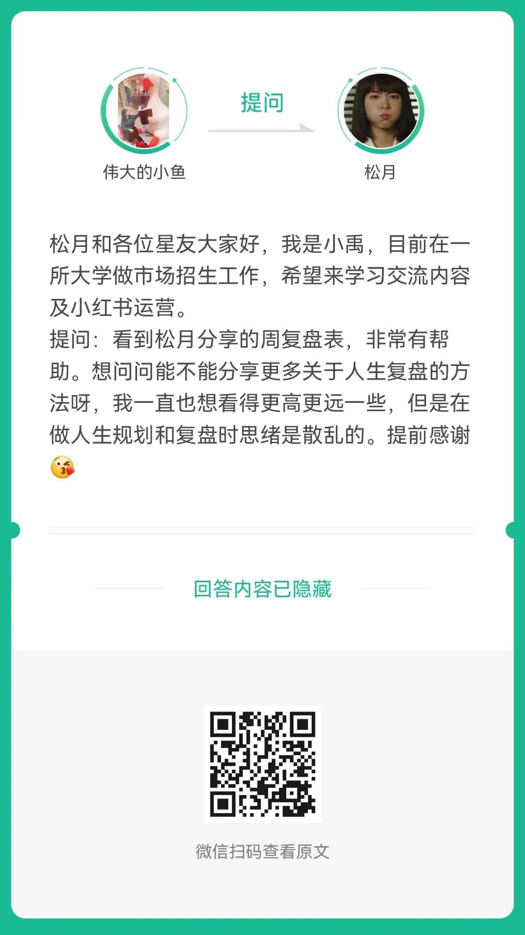 1、提问:能不能分享更多关于人生复盘的方法呀?(扫码查看全文)