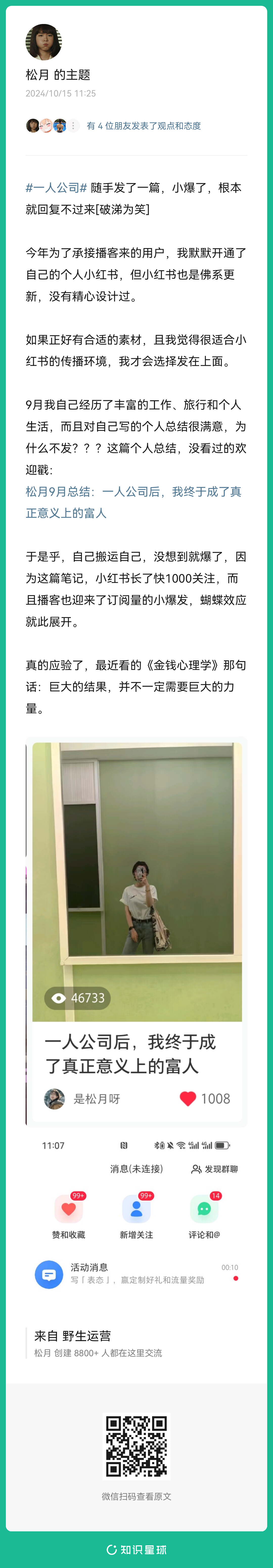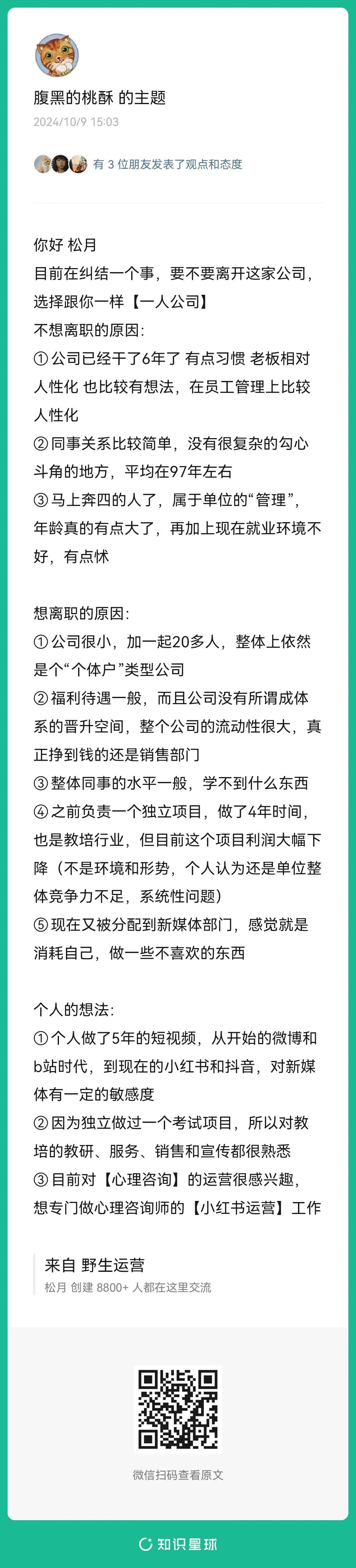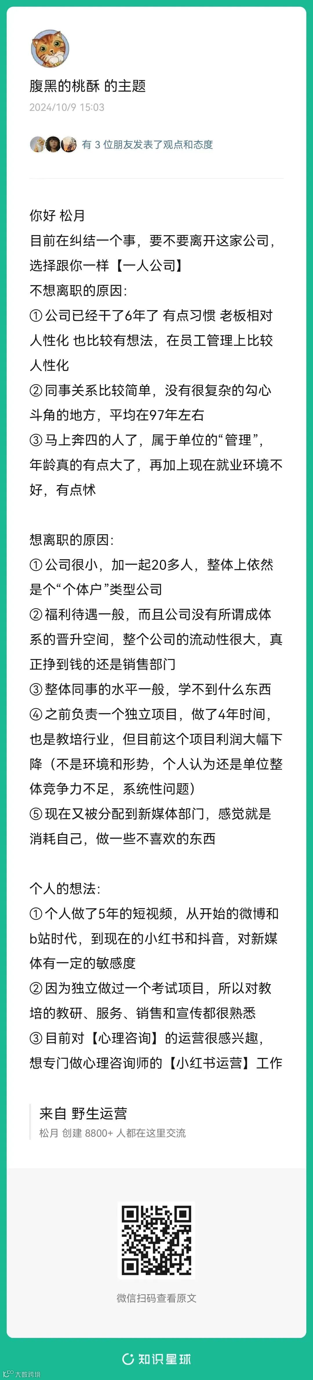 4、提问:目前在纠结一个事,要不要离开这家公司,选择跟你一样【一人公司】?(扫码查看全文)