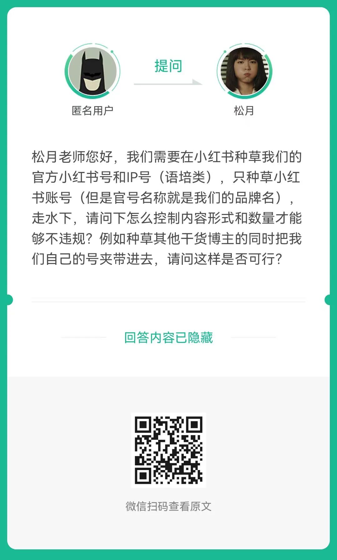 2、提问:小红书走水下,请问下怎么控制内容形式和数量才能够不违规?(扫码查看全文)
