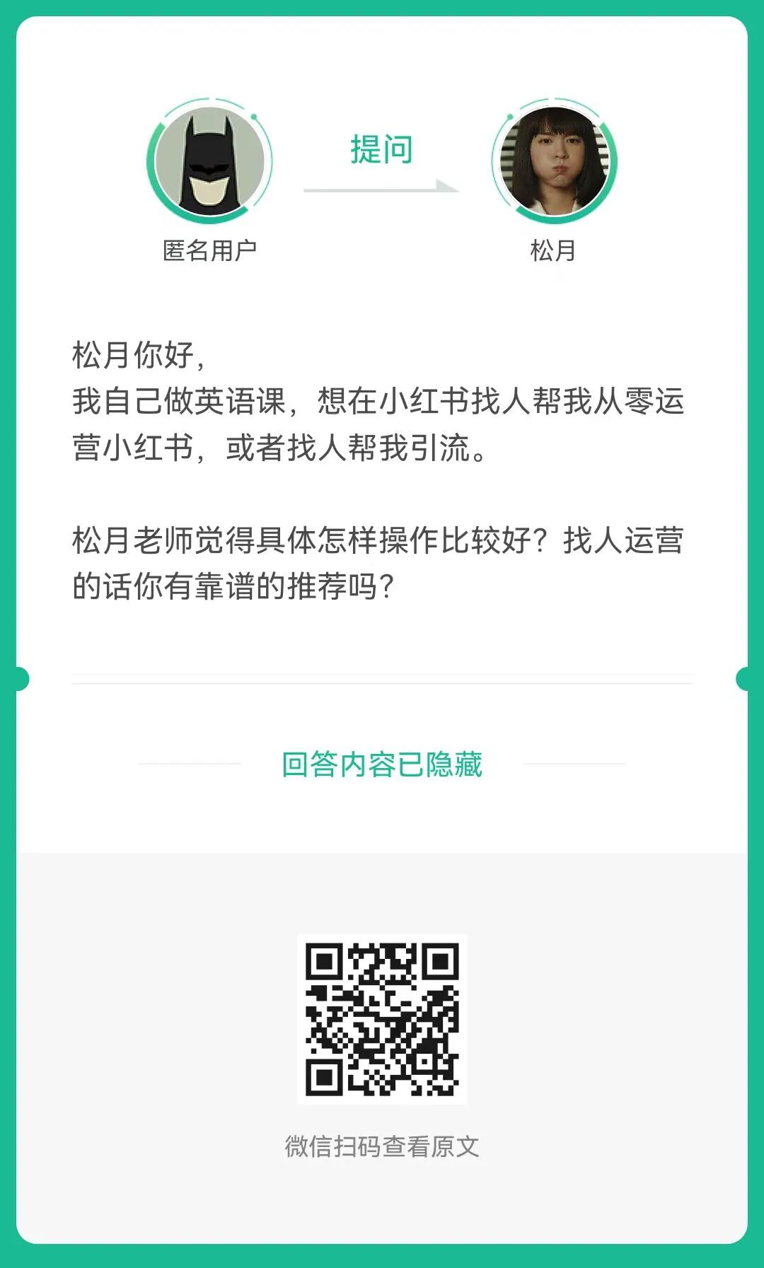 9、提问:我自己做英语课,想在小红书找人帮我从零运营小红书,或者找人帮我引流。具体怎样操作比较好?(扫码查看全文)