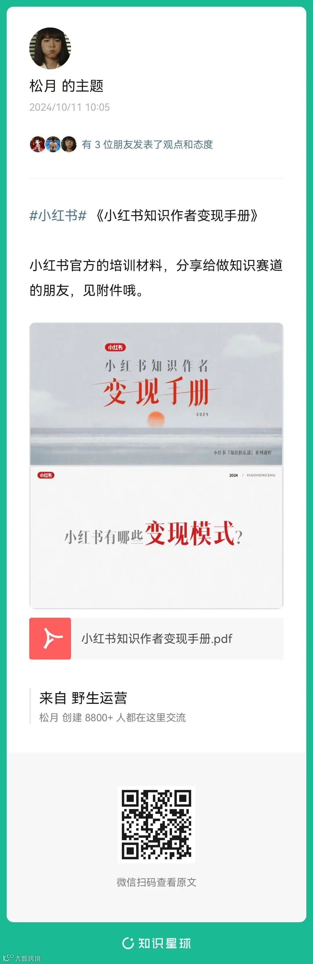 4、松月:《小红书知识作者变现手册》(扫码查看全文)