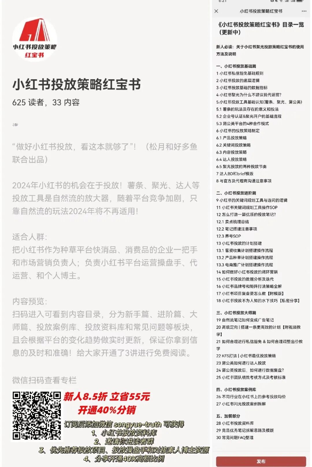 年底啦,小红书投放如何做成为很多人的关注点~本月我和好多鱼共著的专栏《小红书投放策略红宝书》有活动哦,8.5折入手(立省55元)并且开通了40%赏金,月底涨价到499元,扫码即可订阅,订阅后私聊松月或好多鱼,邀请你进读者群,高质量投放操盘手大本营等你!