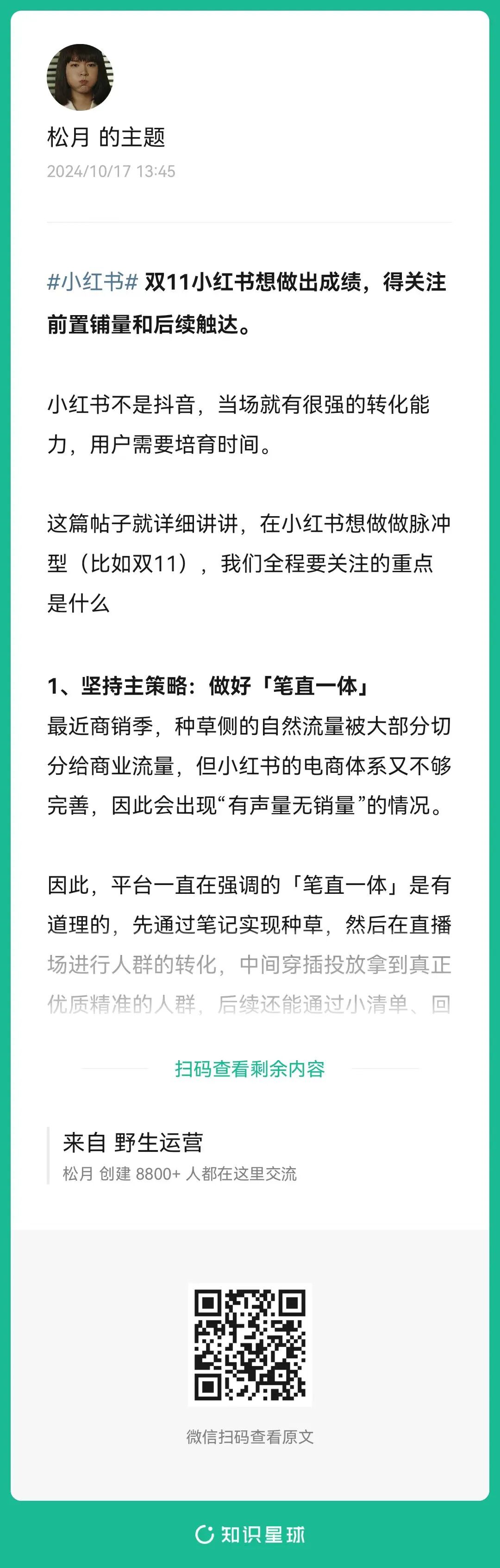 16、松月: 双11小红书想做出成绩,得关注前置铺量和后续触达(扫码查看全文)