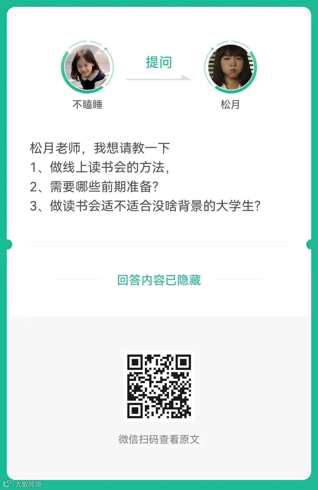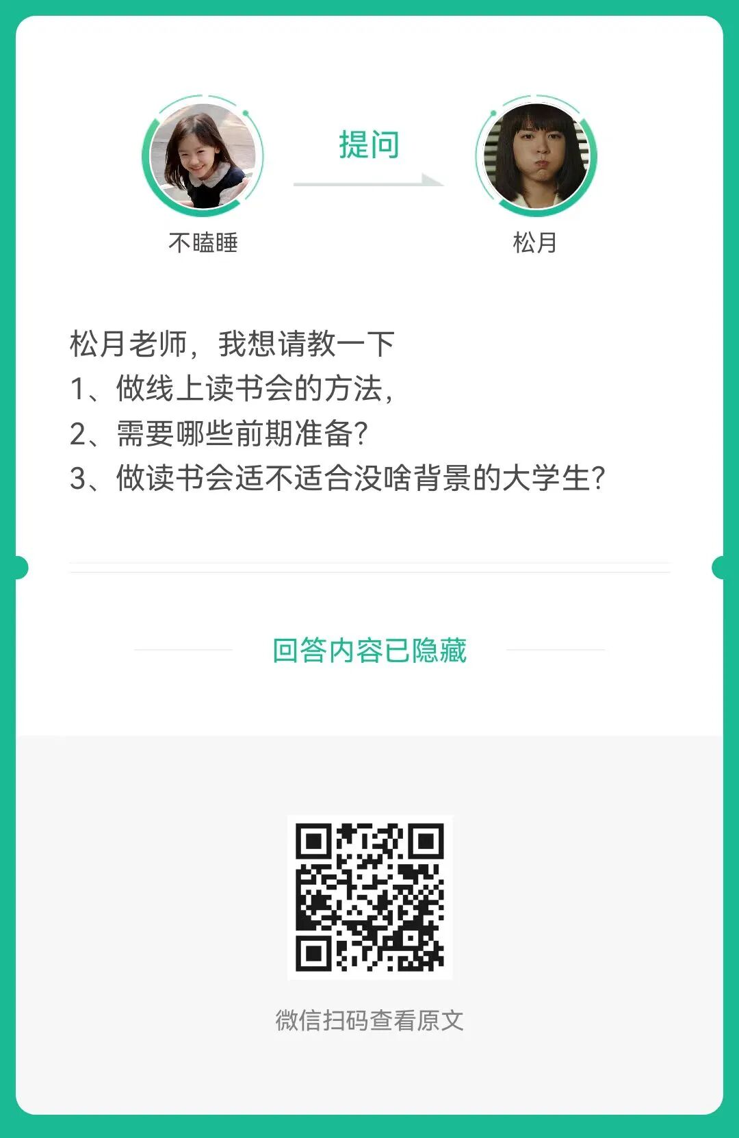 5、提问:做线上读书会的方法,需要哪些前期准备?做读书会适不适合没啥背景的大学生?(扫码查看全文)