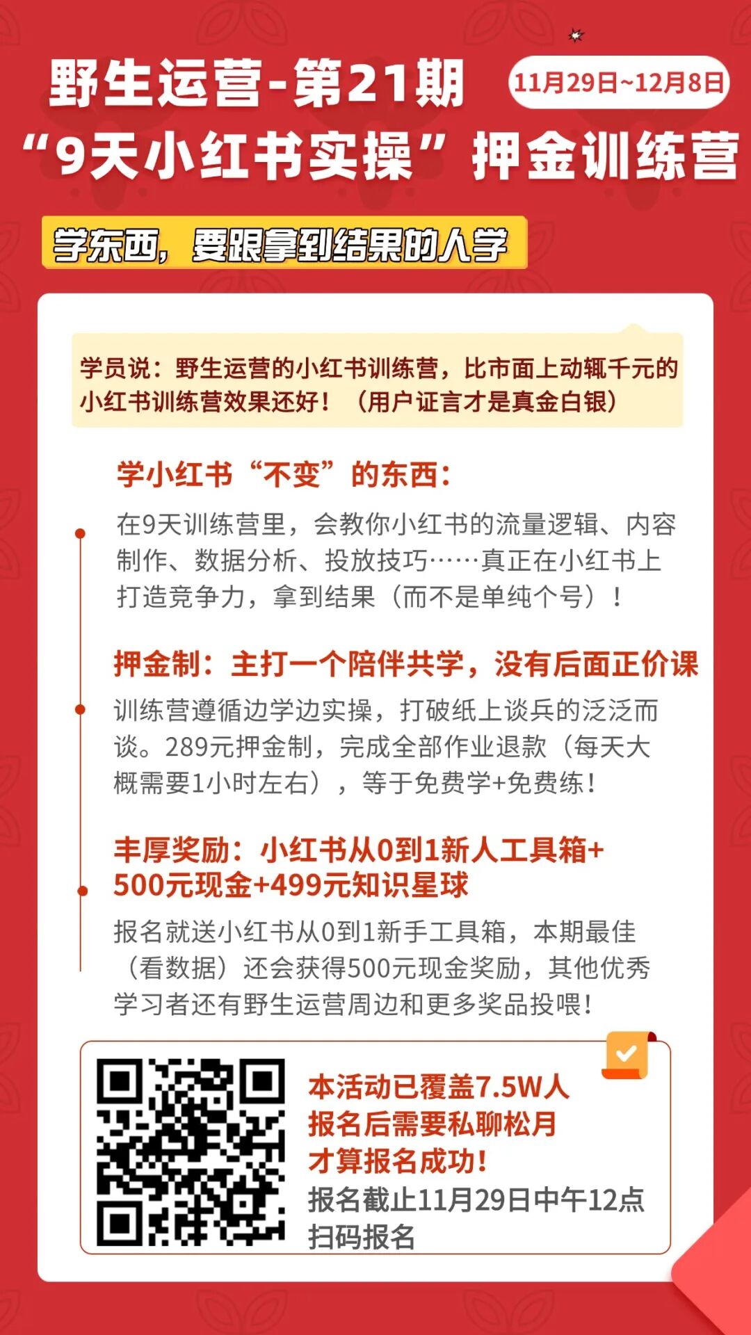 第21期野生运营“9天小红书实操”押金制训练营(11.29~12.8)明晚开营,