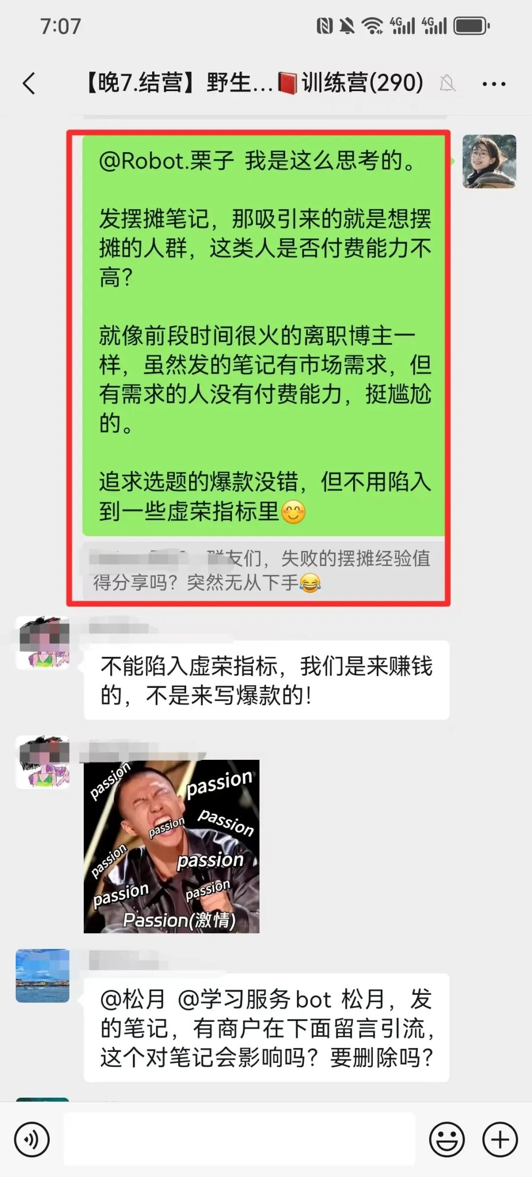 发摆摊笔记,那吸引来的就是想摆摊的人群,这类人是否付费能力不高?就像前段时间很火的离职博主一样,虽然发的笔记要有需求,但有需求的人没有付费能力,挺尴尬的。追求选题的爆款没错,但不用陷入到一些虚荣指标里。