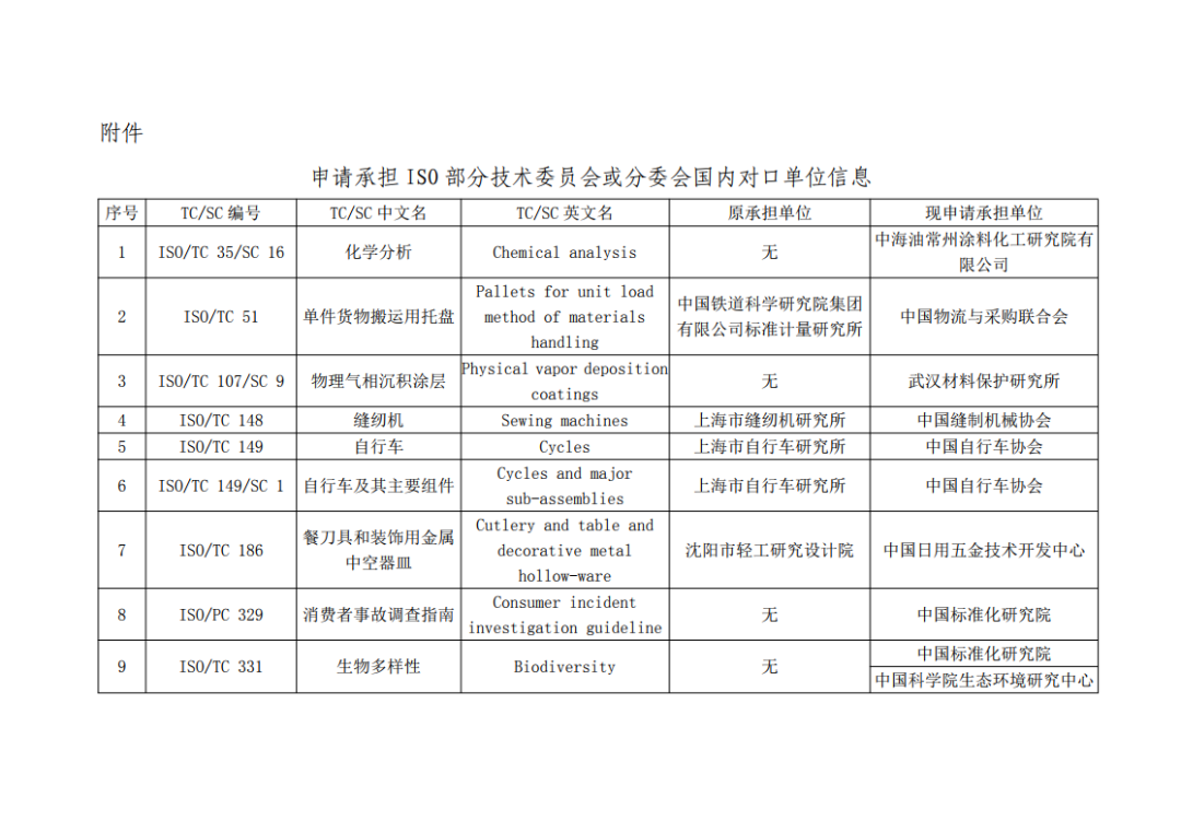 关于对拟申请承担国际标准化组织(ISO)部分技术委员会及分委会国内技术对口单位信息进行公示的通知