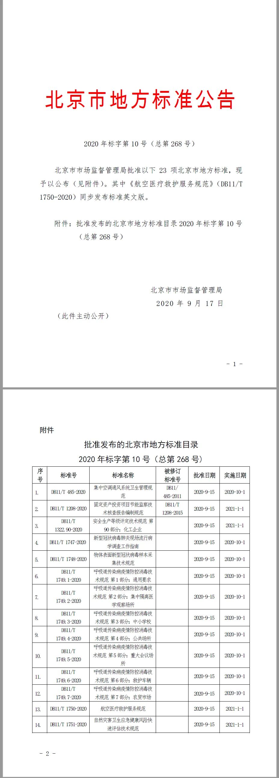北京市市场监督管理局批准以下23项北京市地方标准,现予以公布(见附件)。其中《航空医疗救护服务规范》(DB11/T 1750-2020)同步发布标准英文版。