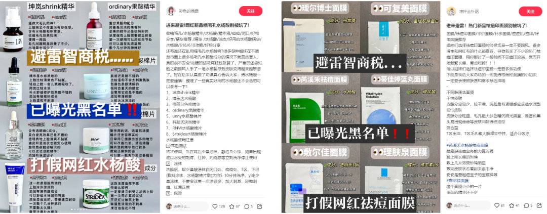 还拿洗面奶来说,就比如下面的这类笔记,只是通过多个祛痘产品放在一起展示,就给产品标记上了功效关键词,并没有“真实感”的体验角度去说服用户。除此之外最关键的一点就是用“会伤肤的祛痘精华”的封面关键词去吸引用户,可能你的用户还没有被吸引来,反而吸引了你提及的竞品方来投诉笔记。不仅笔记会被下架,可能还会影响到账号状态,得不偿失