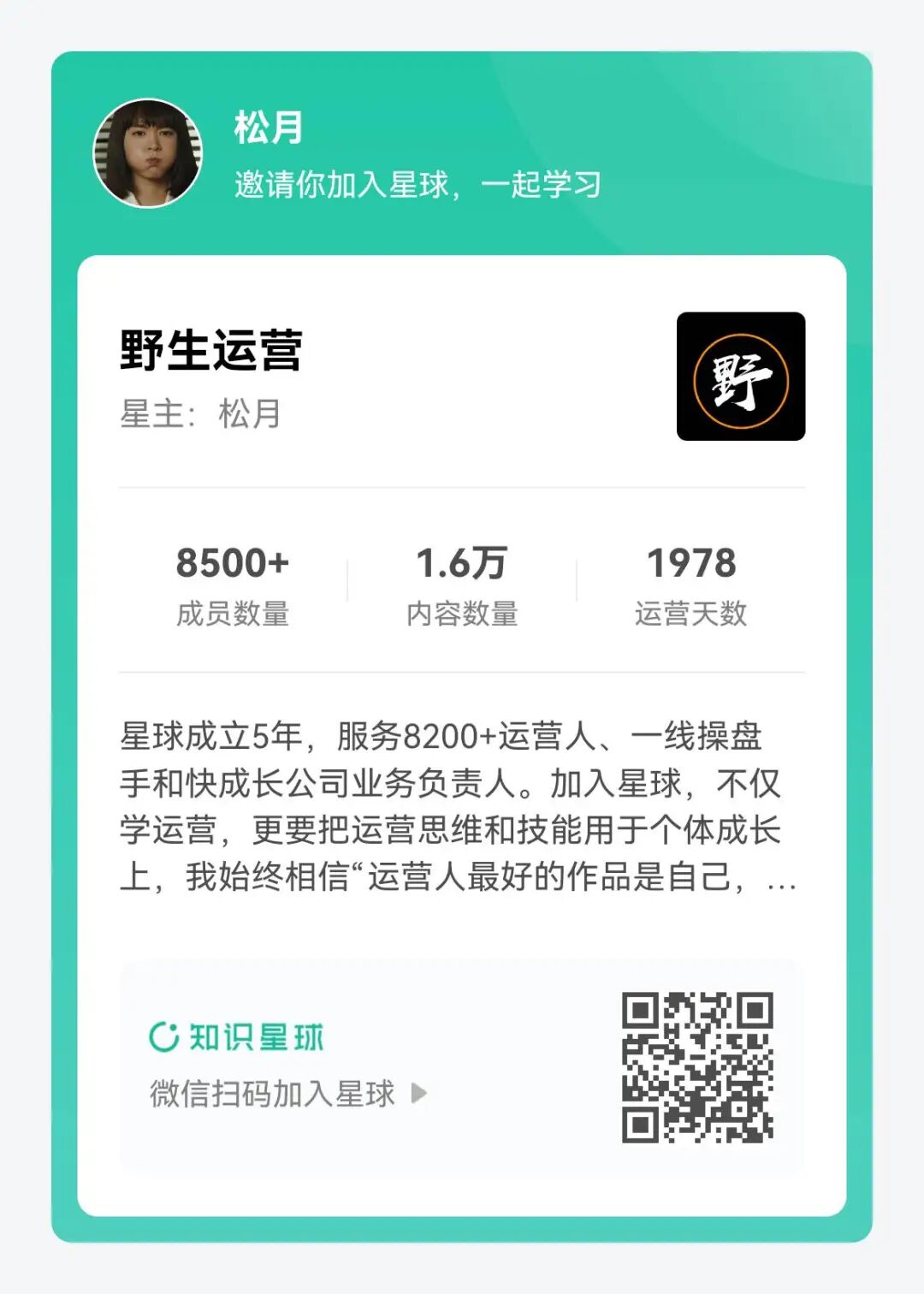 欢迎加入野生运营星球,每月两快闪分享、运营人学习一手资料、1V1答疑……等硬核干货,而且还能一次入手包括上万个案例拆解全库、190+场群分享的音频+逐字稿、N多运营工具包和资料,就问你一句,值不值?