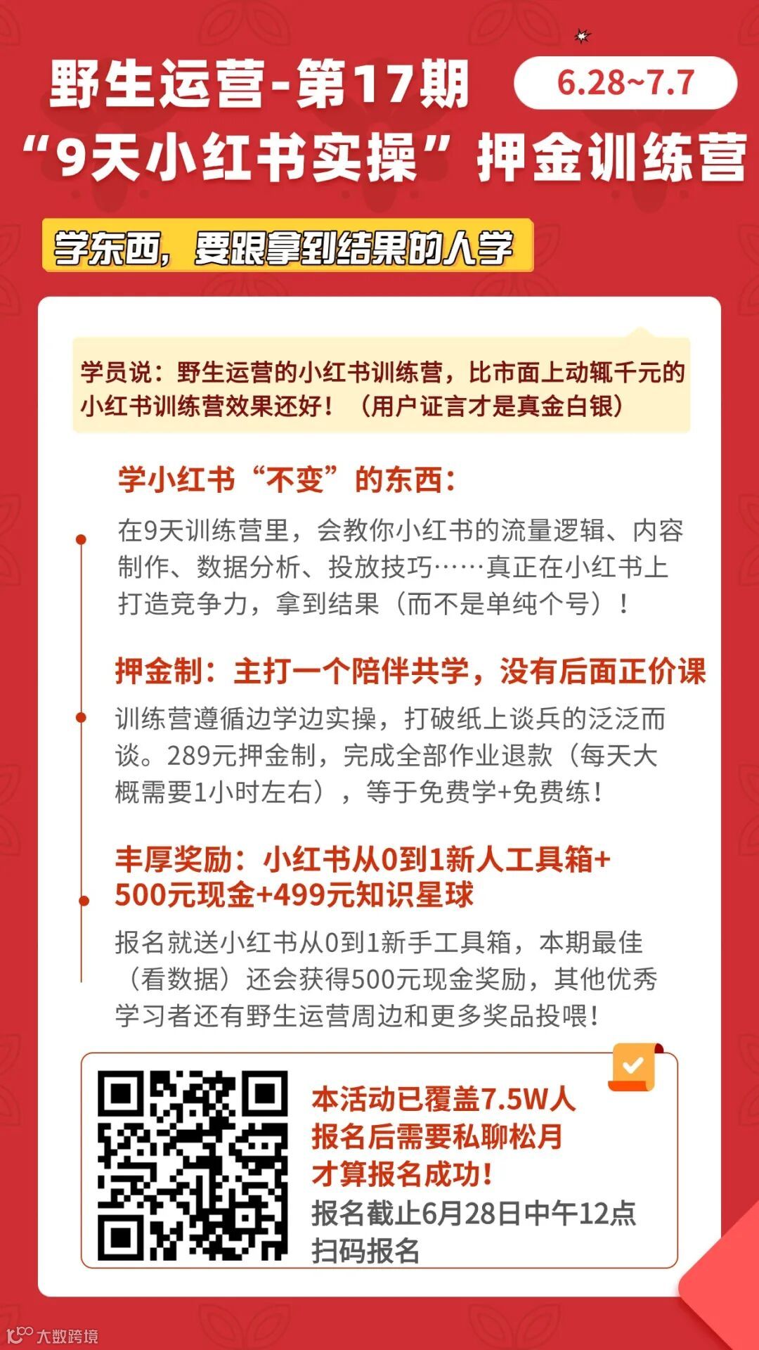 气氛都烘托到这了,必须上个链接,最新一期“17期野生运营-9天小红书实操训练营”(6月28日~7月7日)来啦,这次重点放在小红书个人变现的方式、思路、案例上,如果想在小红书上赚到钱,就等你咯!