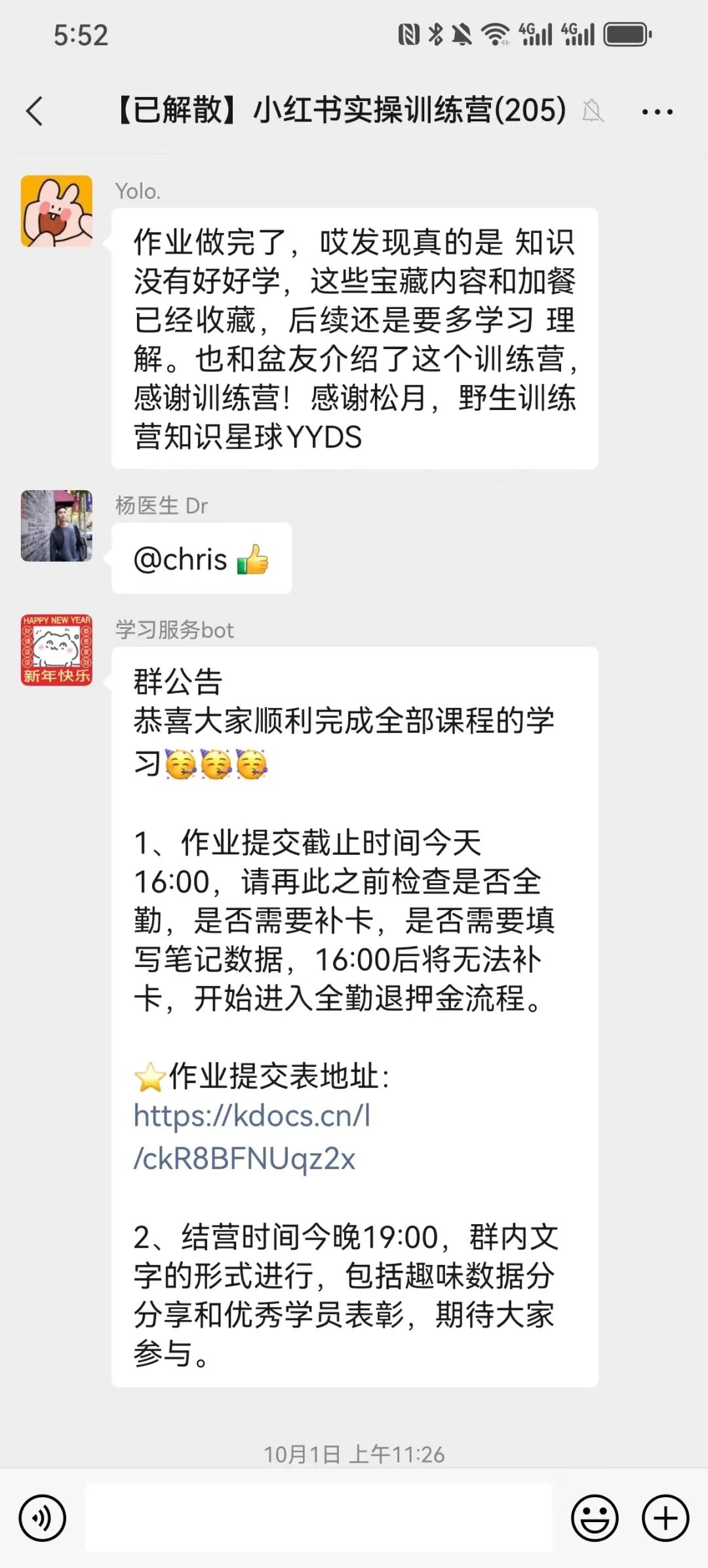每天早上9点半,老师会把每天的课程和配套练习题发到群中,课程可以帮助大家掌握小红书内容和运营的基础知识,非常重要!