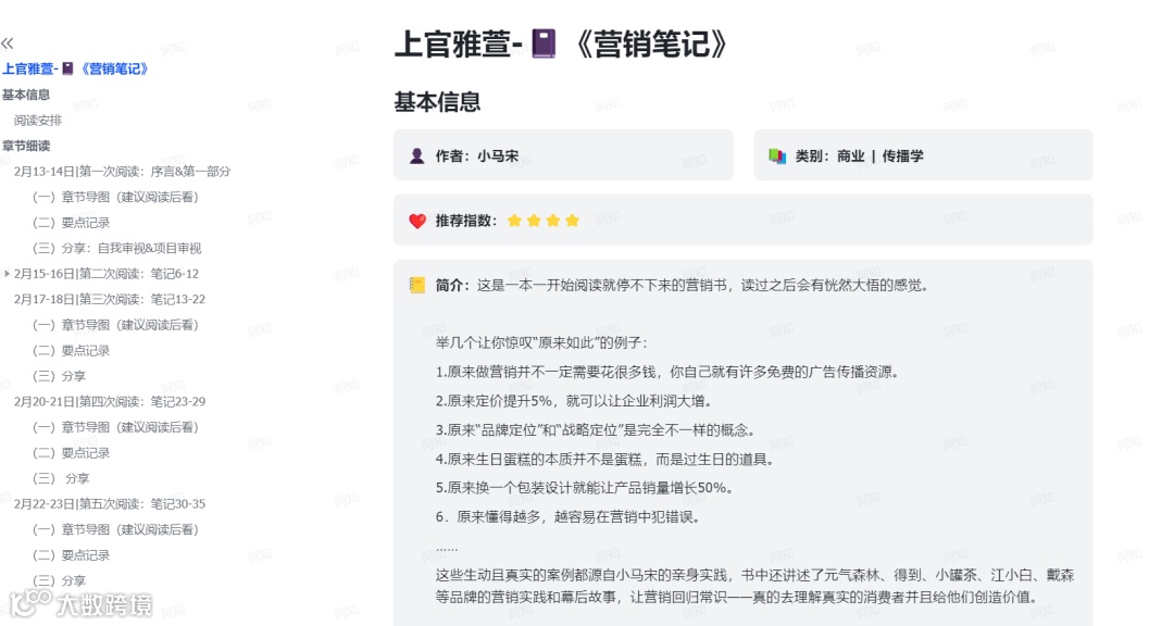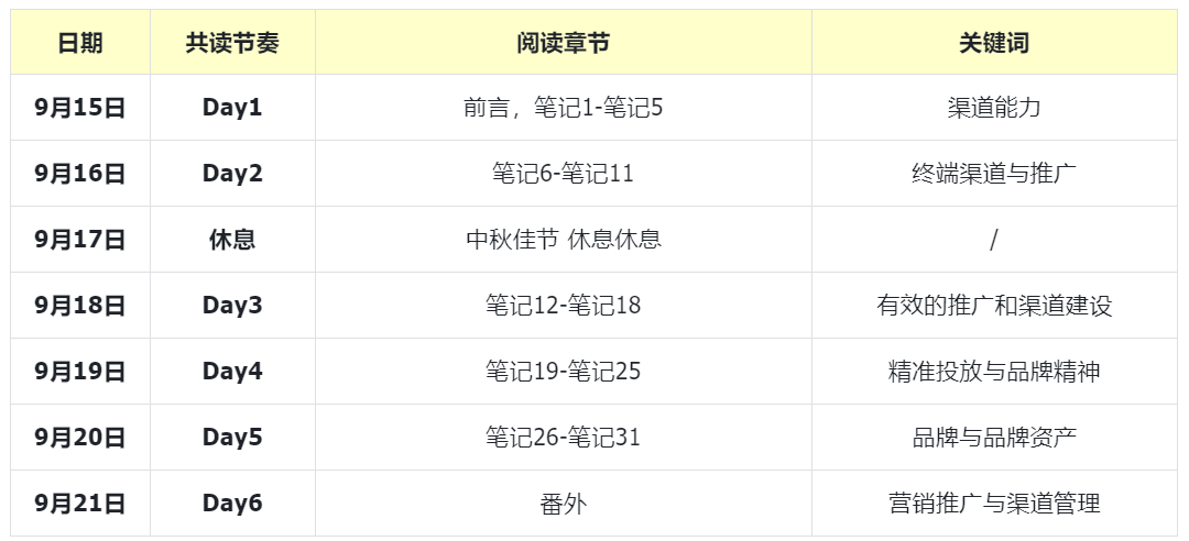 而加入共读因为有领读的带领,让你更有方向。领读人给大家安排好了阅读节奏,准备好了领读笔记。大家只需要每天跟着节奏,完成对应读书任务即可。