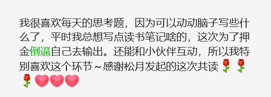 很多可能平时没有读书习惯的伙伴,或者没有输出习惯的伙伴,靠着押金的动力倒逼自己不断的读书+输出,逐渐形成了很好的阅读习惯~