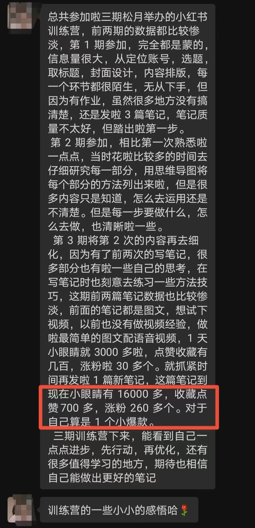 比如,有的小伙伴从完全不懂小红书,到在训练营里涨粉、变现、形成了自己的商业小宇宙,作为一路陪跑的我来说,我真的发自内心的开心。