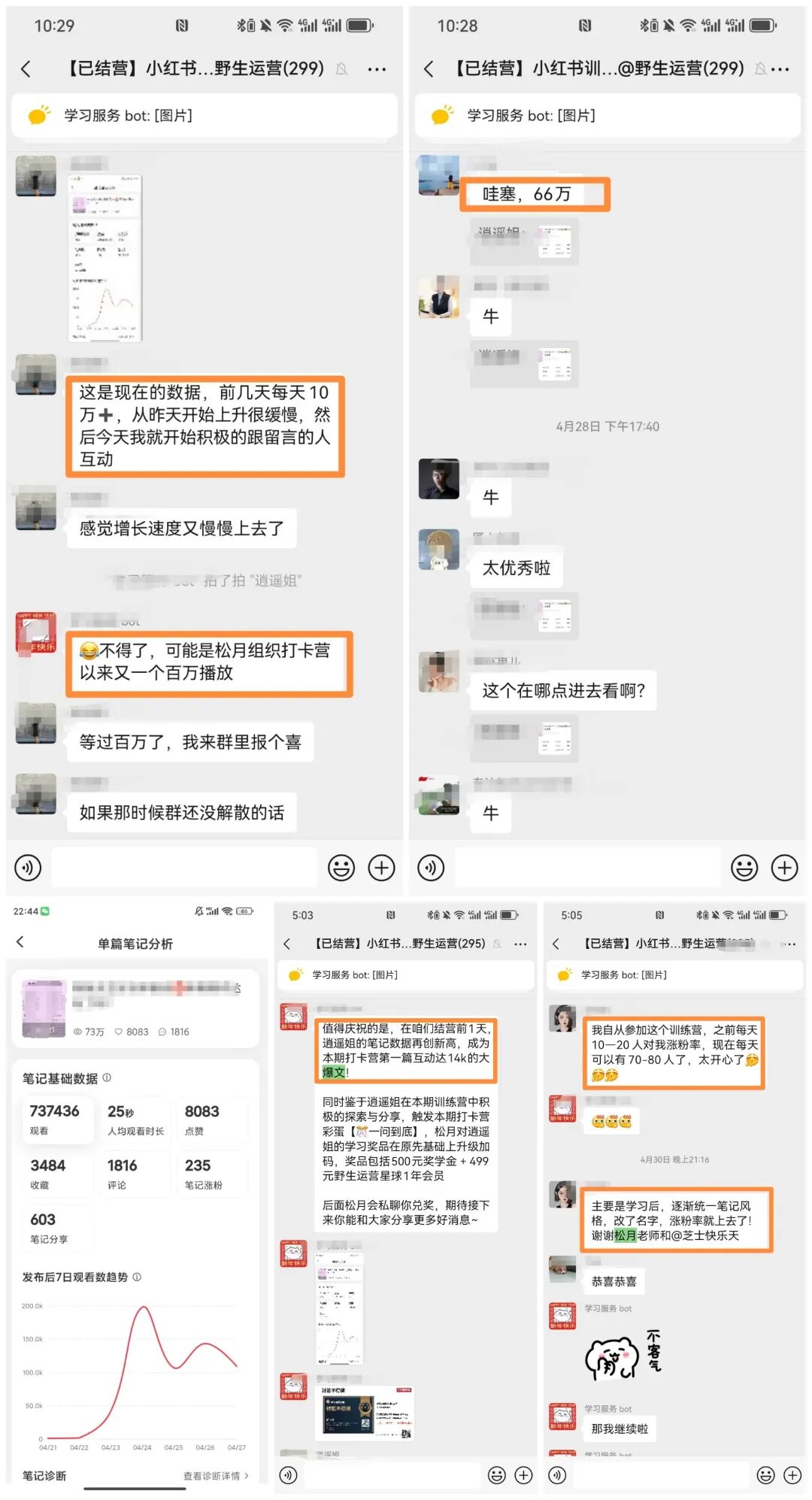 每月一期的训练营结束,大家的成绩都会让我惊喜了:单篇笔记66W+小眼睛(数据还在狂涨中)、帮助公司完成小红书企业号冷启动、低粉爆文成功引流变现高客单私域产品……