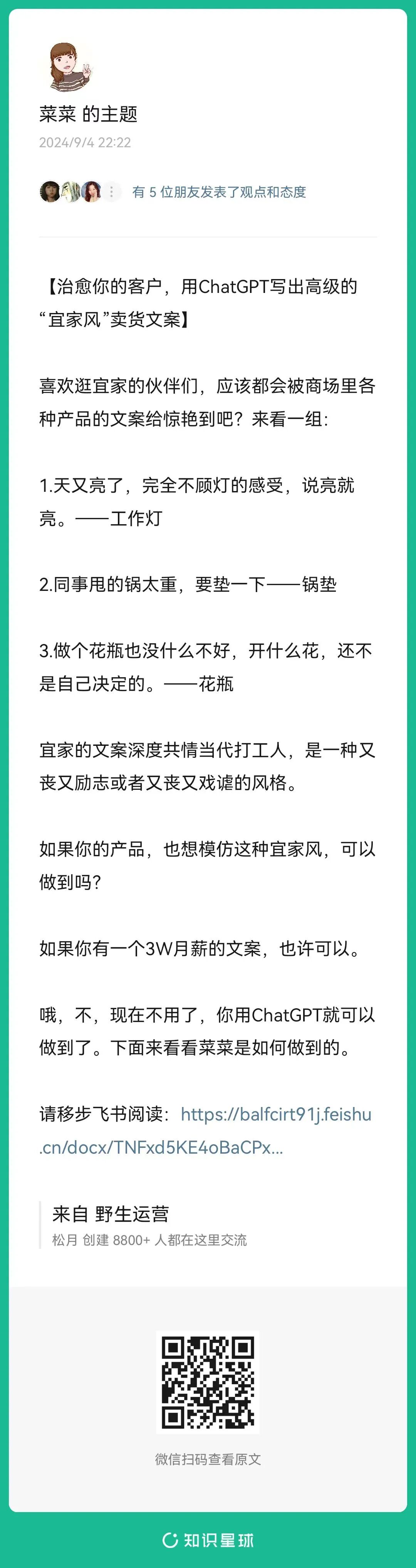 11、菜菜:用ChatGPT写出高级的“宜家风”卖货文案(扫码查看全文)