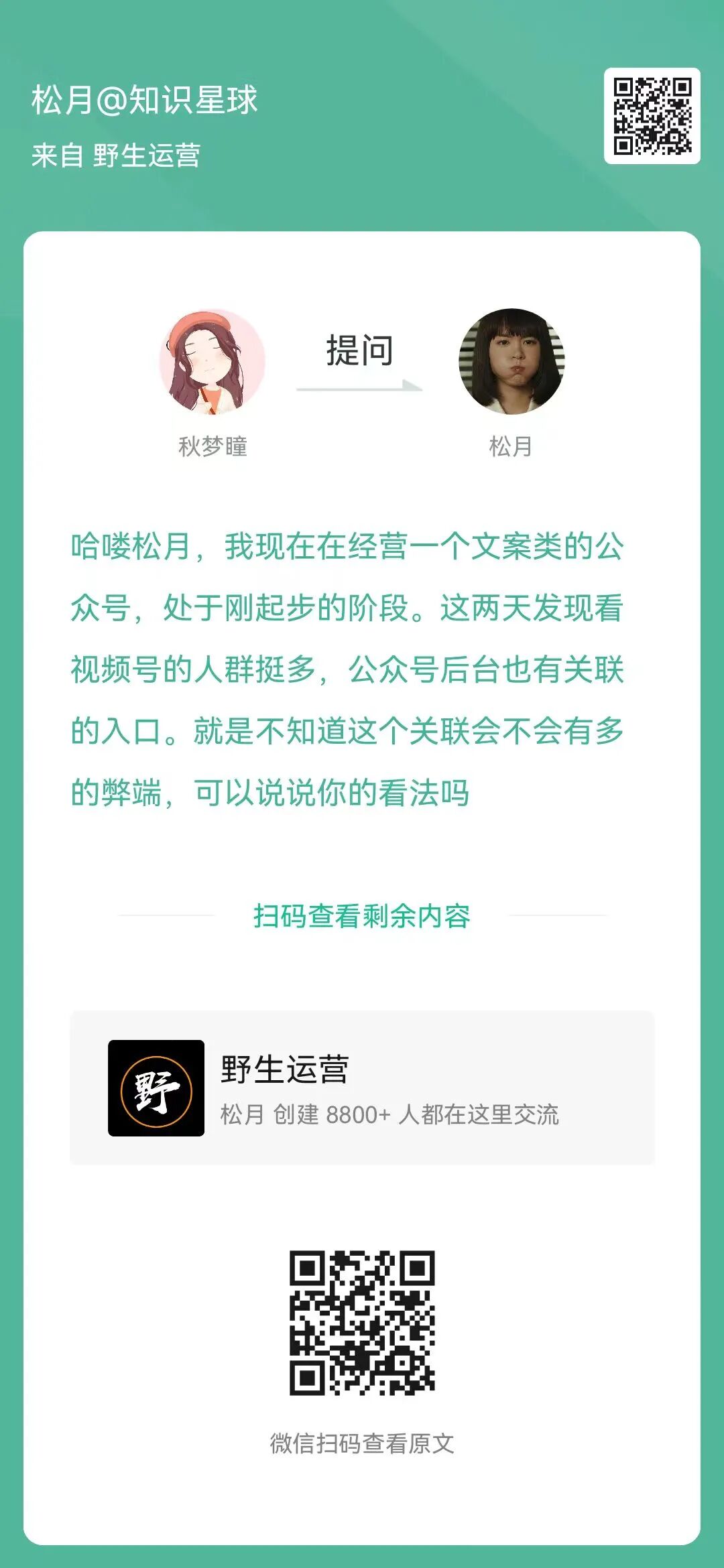 4、提问:我现在在经营一个文案类的公众号,处于刚起步的阶段。这两天发现看视频号的人群挺多,公众号后台也有关联的入口。就是不知道这个关联会不会有多的弊端?(扫码查看全文)