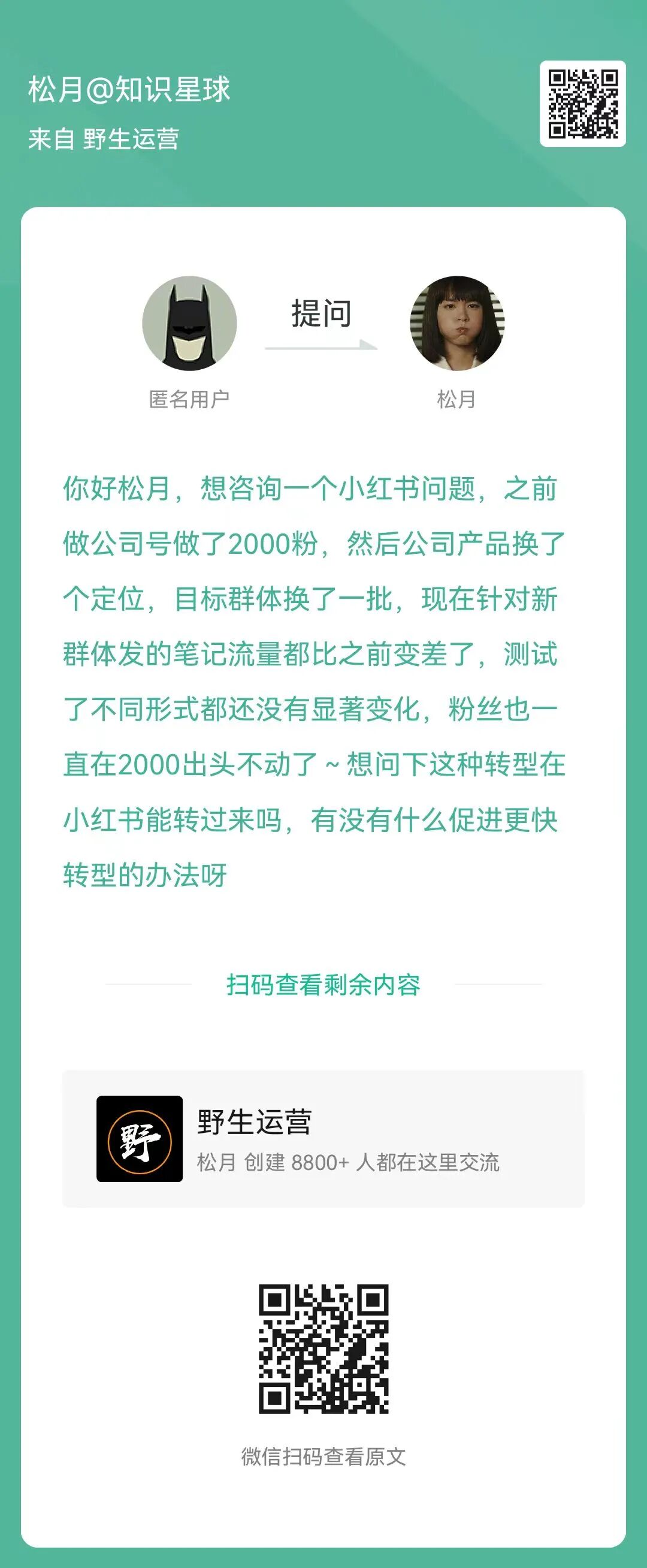 1、提问:之前做公司号做了2000粉,然后公司产品换了个定位,目标群体换了一批,想问下这种转型在小红书能转过来吗,有没有什么促进更快转型的办法呀?(扫码查看全文)
