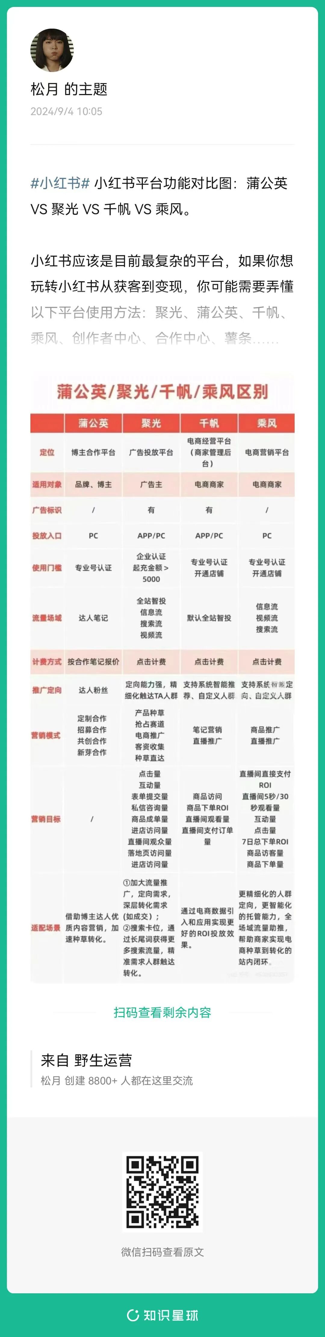 7、松月:小红书平台功能对比图:蒲公英 VS 聚光 VS 千帆 VS 乘风(扫码查看全文)