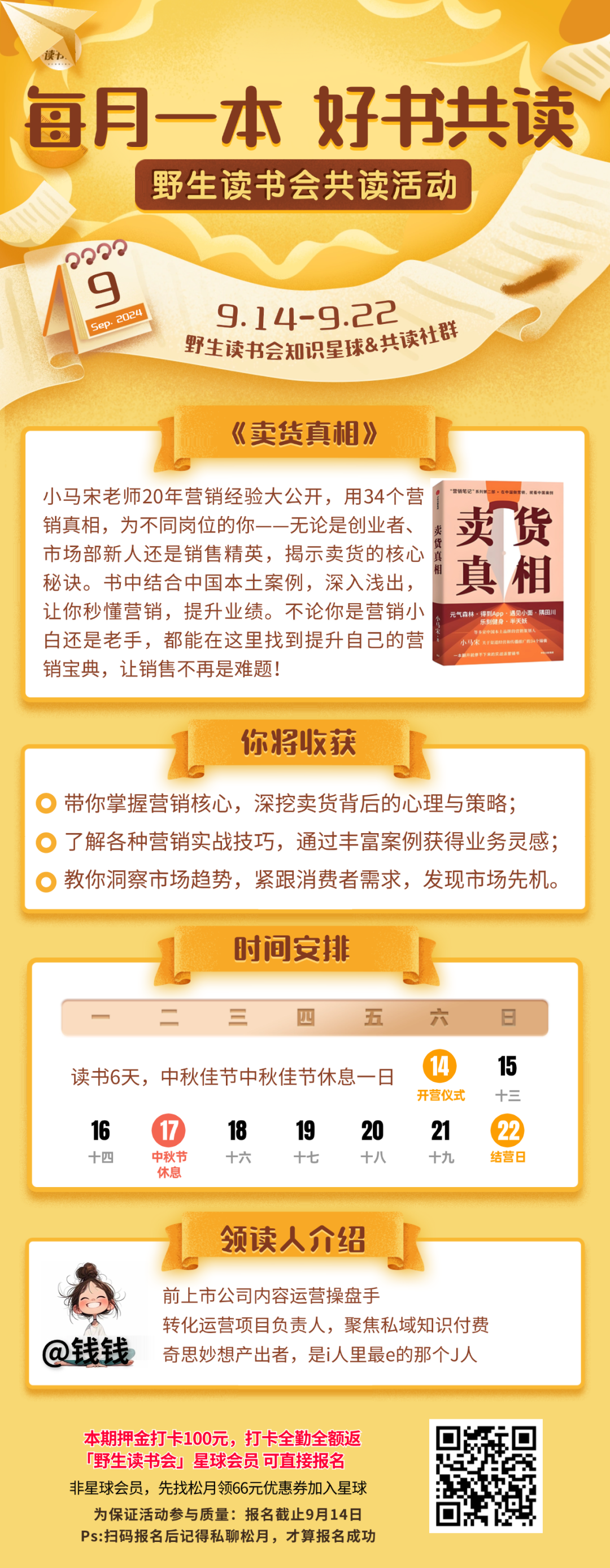 本月「野生读书会」(9.14~9.22)一起共读的是小马宋老师的新书《卖货真相》,本周六开营!正好中秋假期,来一段沉浸的阅读时光吧