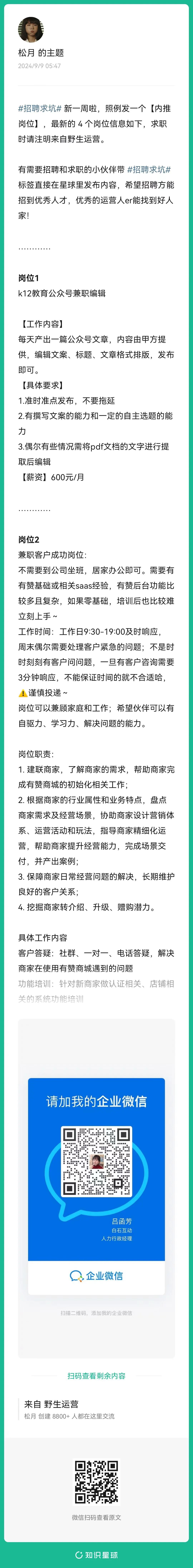 上周更新了 4 个岗位信息如下,求职时请注明来自野生运营,扫码申请岗位👇