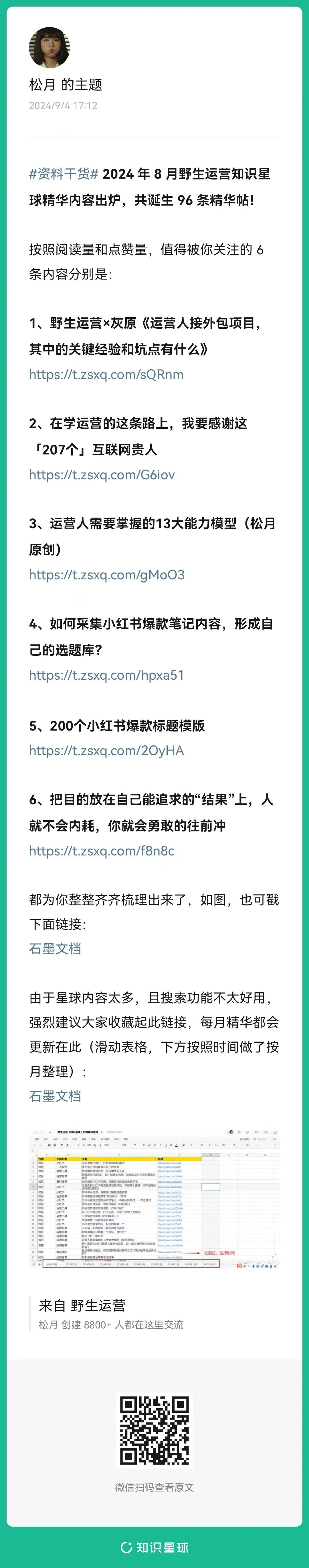 10、松月:2024 年 8 月野生运营知识星球精华内容出炉,共诞生 96 条精华帖