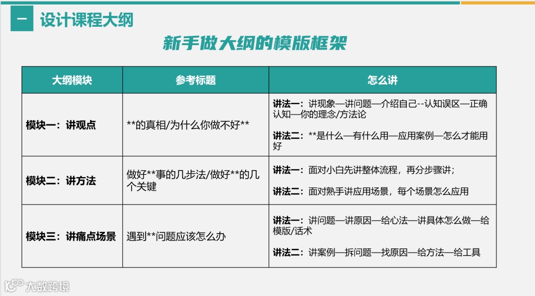 如果一上来就写卖课大纲,你会列很多的问题场景,或者列自己的方法,忽略了问题场景,这些都不对,知识是知识,大纲是大纲,这是两件事。
