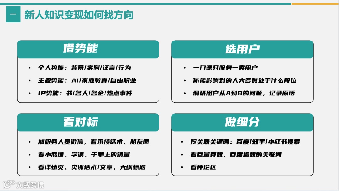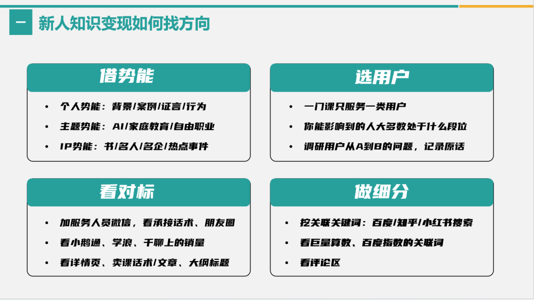 在找用户的细分场景和痛点上,有2个方法,一是你去看对标的课程,看不同销量课程的卖点话术、大纲,第二是通过巨量算数、百度指数等等工具,挖掘关联关键词,去小红书、知乎看同类问题的用户评论,大家问的也就是真的用户痛点。