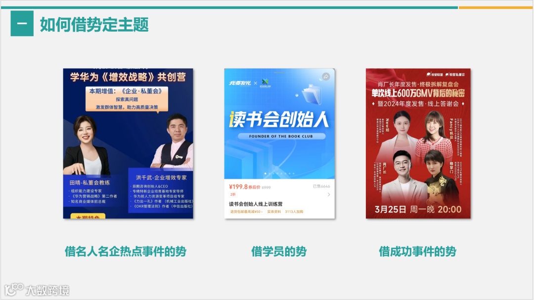 第二个叫读书会创始人训练营,这个借势比较特殊,叫借学员的势,我面向的是创始人,第一你来听我讲,第二你来认识其他的创始人,这个和私董会有异曲同工的效果;