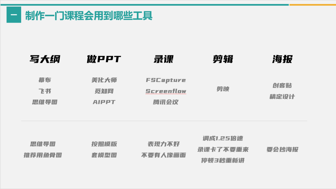 好了,最后一个知识点,就是制作一门课程会用到哪些工具,这部分大家就好理解了对吧,所见即所得。