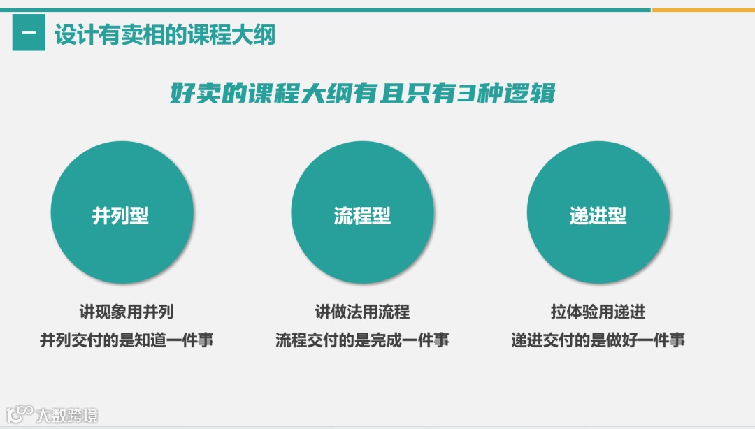 在大纲设计上,分3种,如果你要讲现象,用并列型,让用户知道一件事,如果你要讲方法,用流程型,指引用户做完一件事,如果你做过一两门课程了,可以考虑用进阶型,进阶型就是先交付一个基础方法,再交付一个更有效,但也更有难度的方法,做好进阶型大纲的前提是要理清每种方法应用的前置条件,梳理出知识层次。
