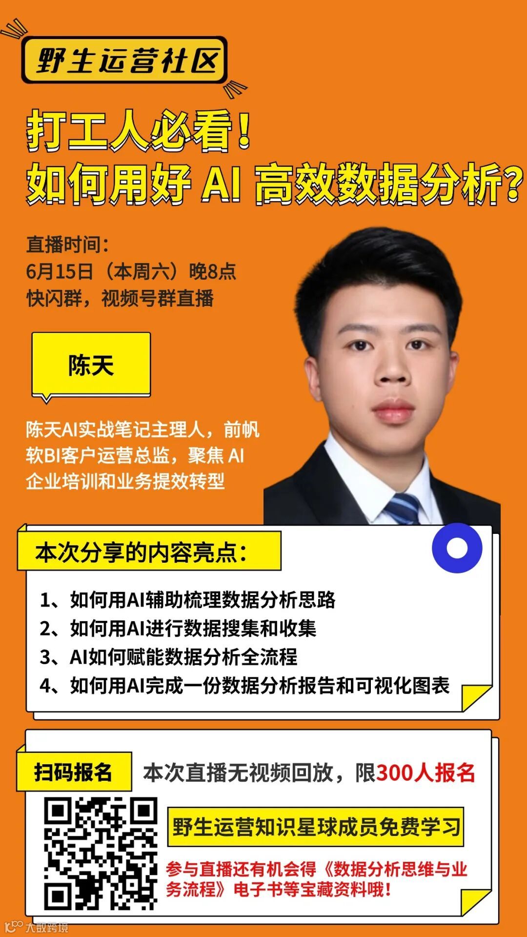 本周六晚8点,在AI圈非常有影响力的陈天老师来啦,将会在野生运营快闪群分享《打工人必看,如何用 AI 开展高效数据分析》。